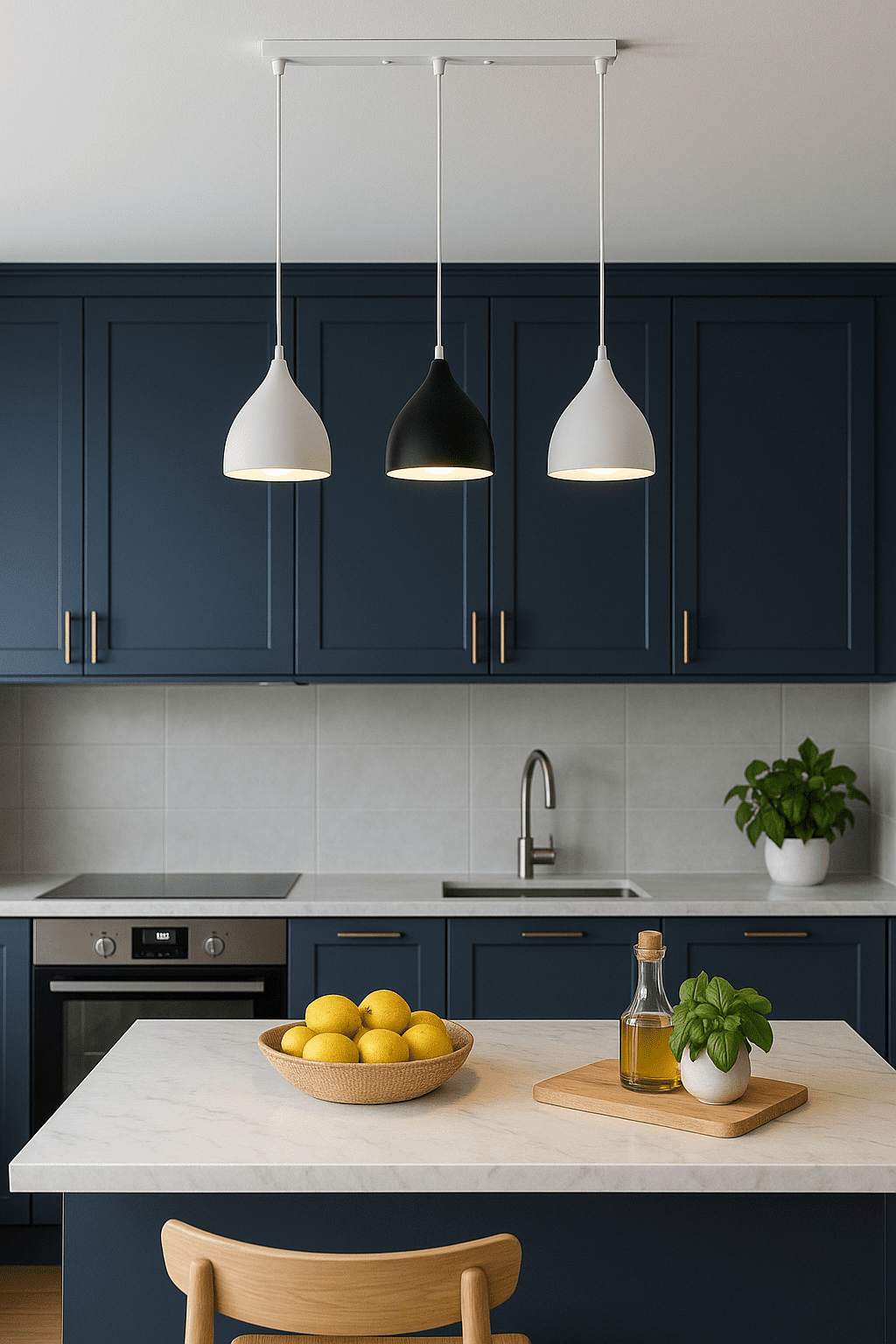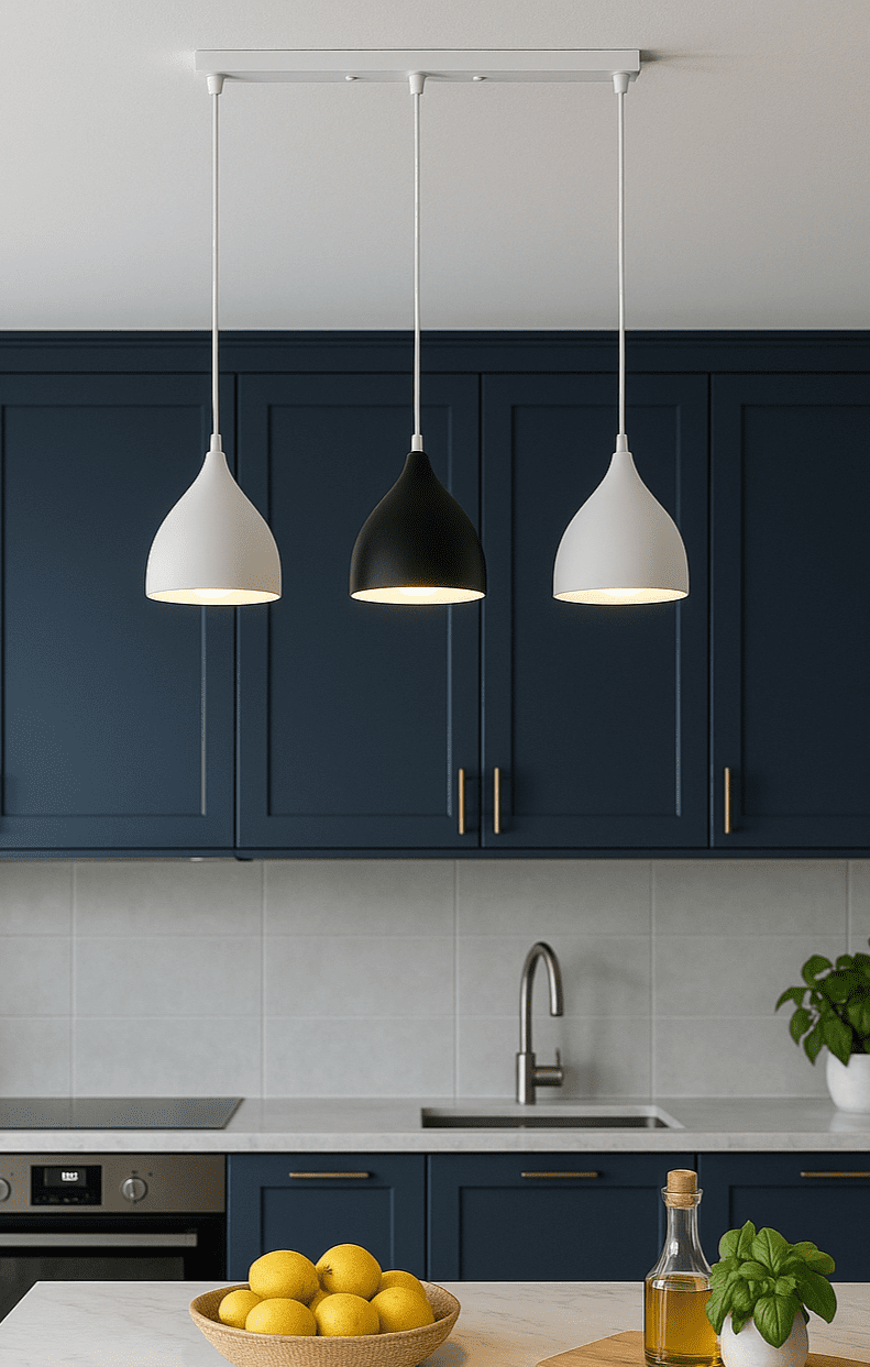 Ky ndriçues elegant me tre drita të varura kombinon stilin minimalist me funksionalitetin modern, duke e bërë perfekt për çdo kuzhinë bashkëkohore. Me trupat në ngjyrë të bardhë dhe të zezë matte, ai ofron një ndriçim të butë dhe të ngrohtë mbi ishullin e kuzhinës, duke krijuar një atmosferë mikpritëse dhe të sofistikuar.