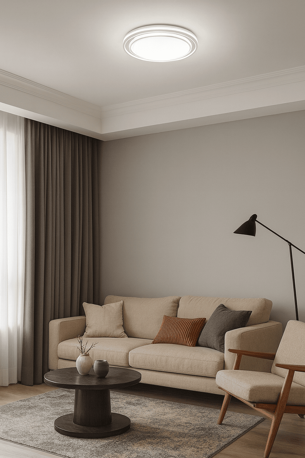 Ndriçues modern me dizajn elegant rrethor, kombinim i ngjyrës së zezë me detaj të artë të brendshëm, që jep dritë të butë dhe të ngrohtë, ideal për ambiente bashkëkohore dhe minimaliste.