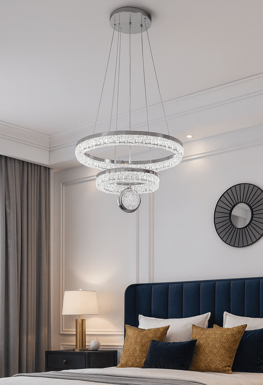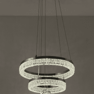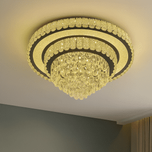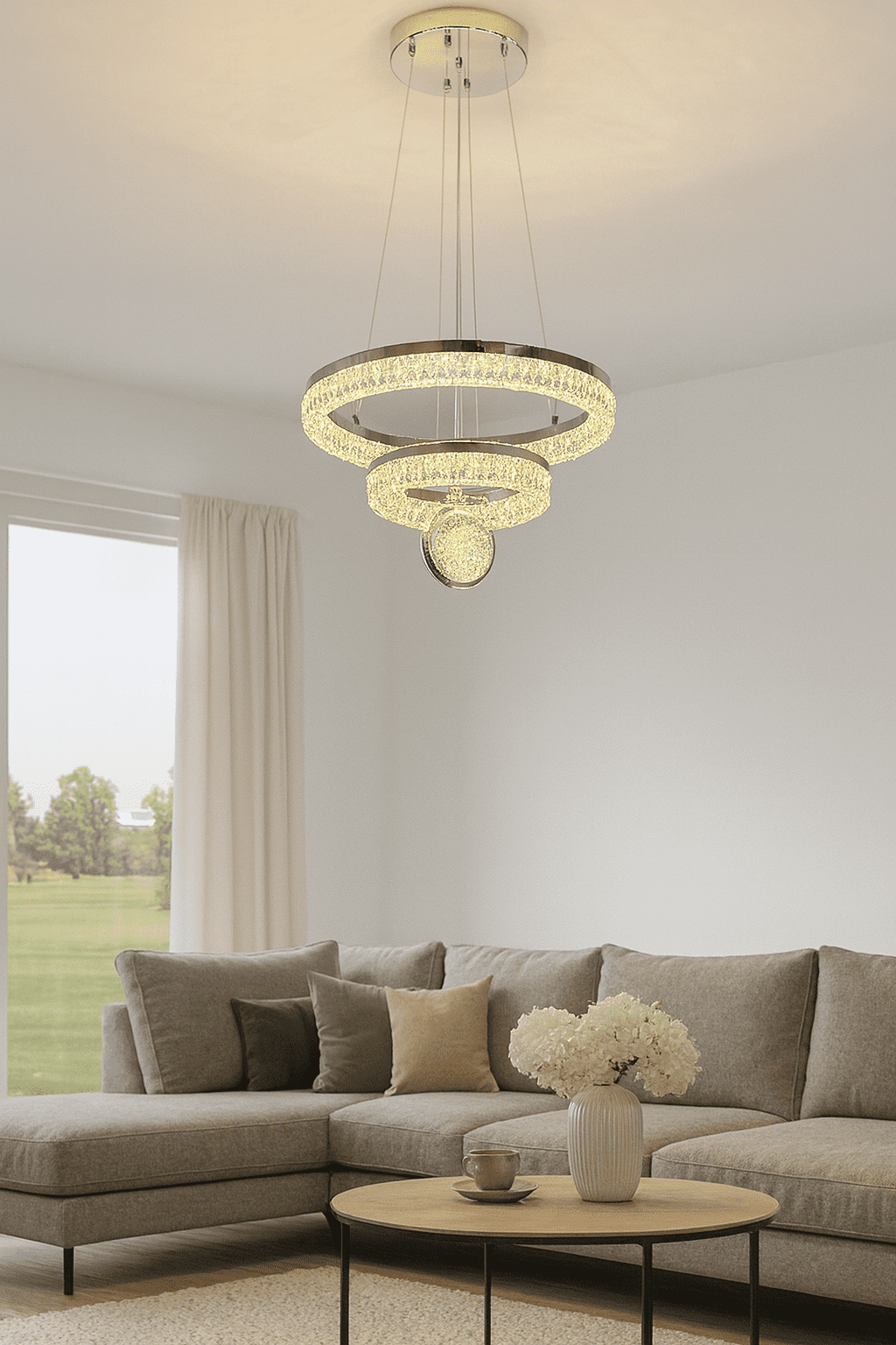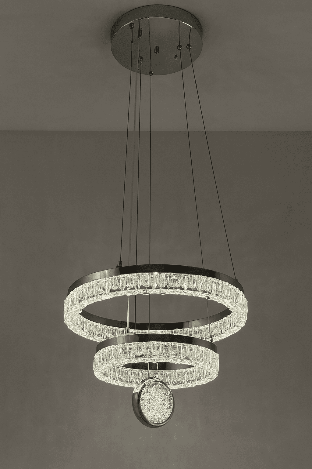 Ndriçues modern me dizajn rrethor kristali, i përbërë nga unaza ndriçuese me shkëlqim elegant dhe strukturë metalike kromi. Jep dritë të bardhë të fortë dhe reflektime luksoze, perfekt për ambiente moderne dhe me stil.