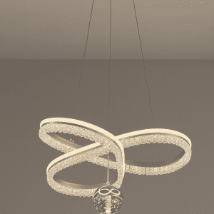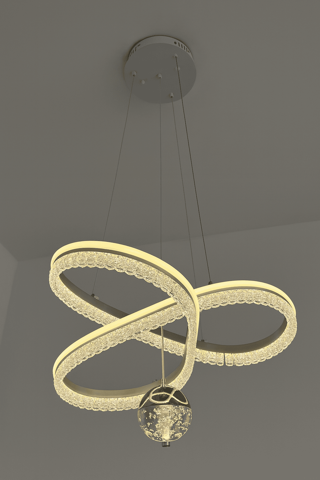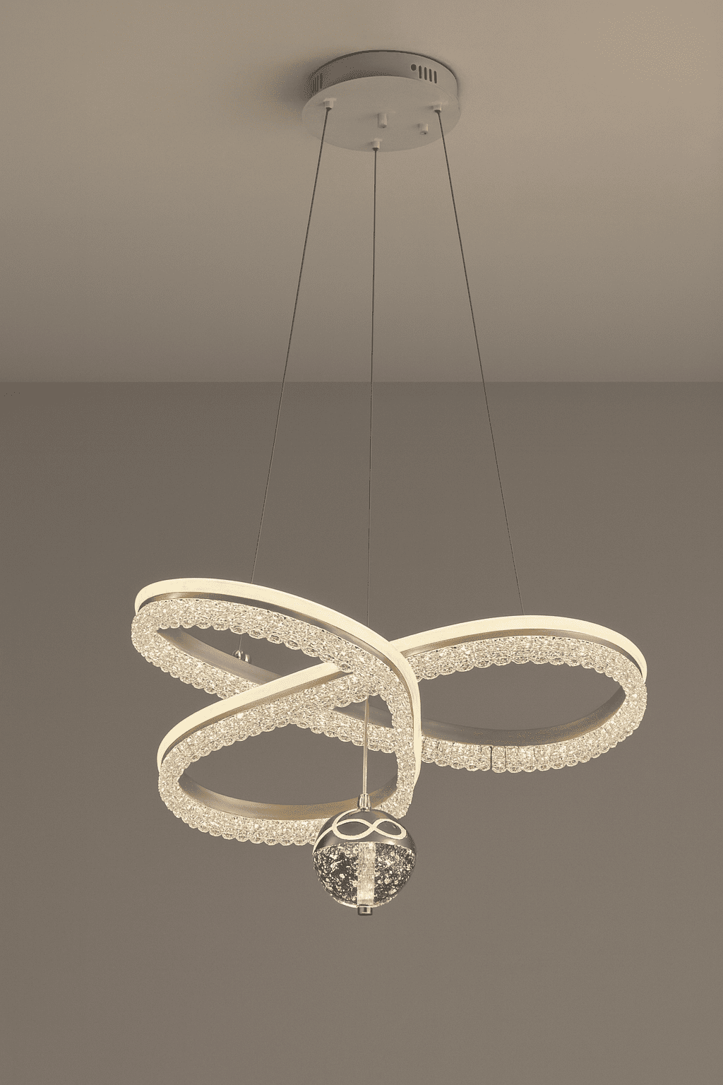 Ndriçues modern LED me dizajn elegant në formë të pafundësisë, i përbërë nga dy unaza kristali që reflektojnë dritë të ngrohtë dhe shkëlqim luksoz. Sfera qendrore me flluska të vogla xhami shton efekt dekorativ dhe ndriçim të butë, ideal për ambiente moderne dhe minimaliste.
