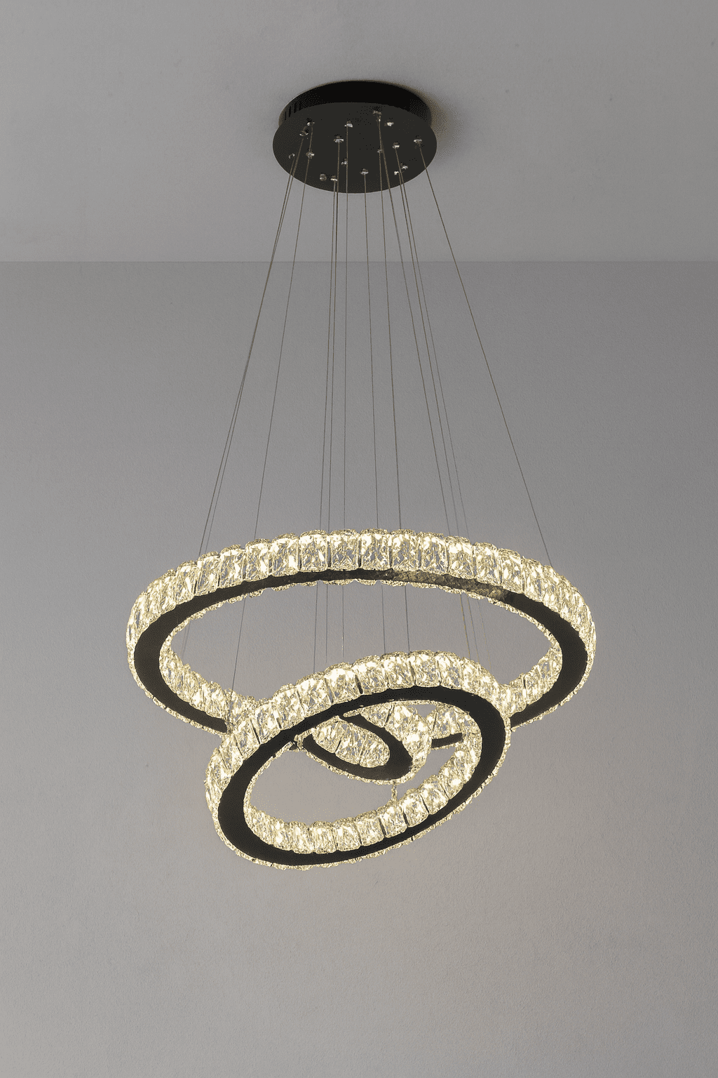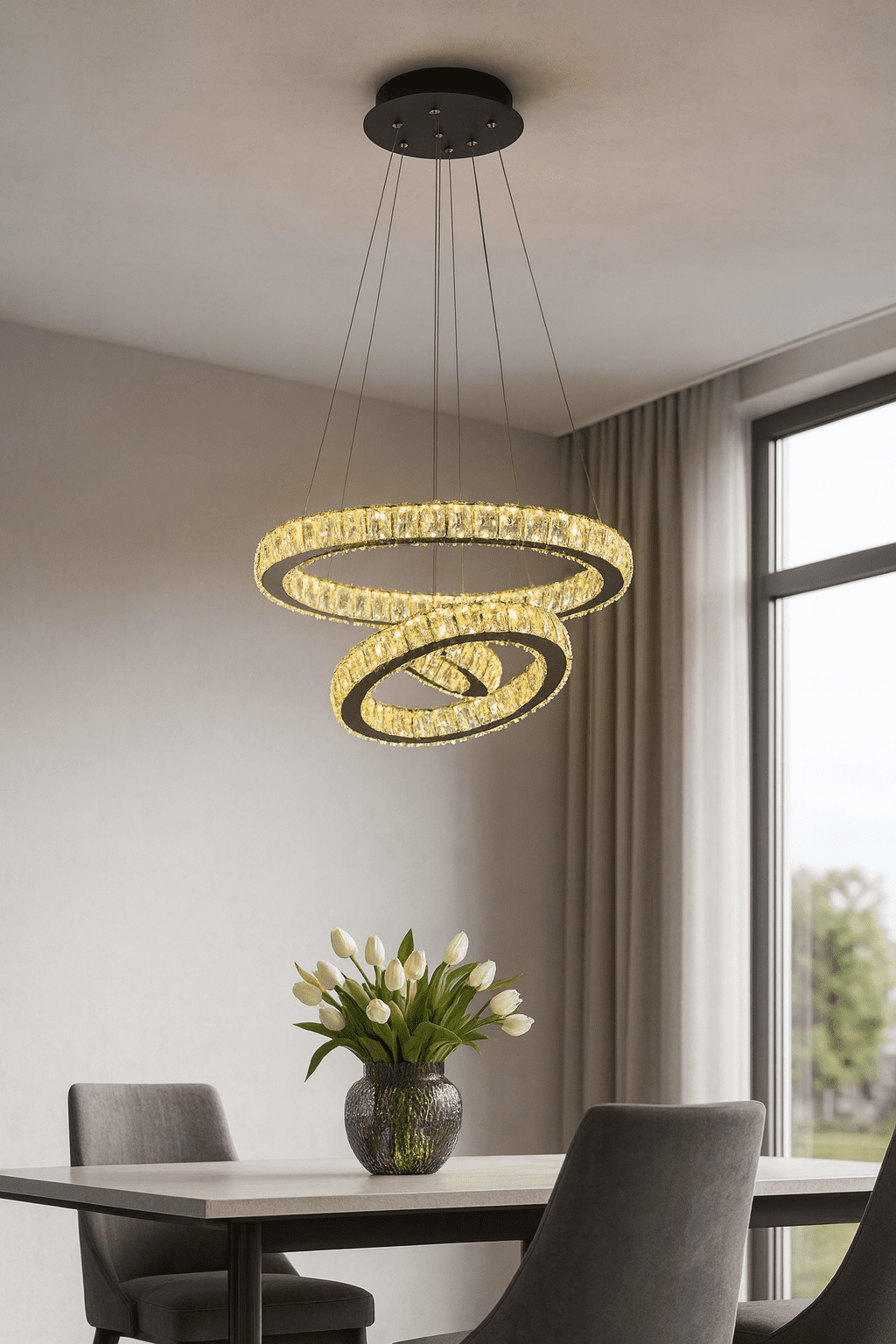 Ky ndriques modern me dizajn spiral të dyfishtë është një kryevepër ndriçimi që sjell luks dhe elegancë në çdo ambient. I punuar me kristale premium që reflektojnë dritën e artë, ai krijon një atmosferë të ngrohtë dhe magjike. Me linja të pastra dhe stil bashkëkohor, ky llambadar është zgjedhja ideale për dhoma ndenjeje, ambiente moderne apo hapësira luksoze.
