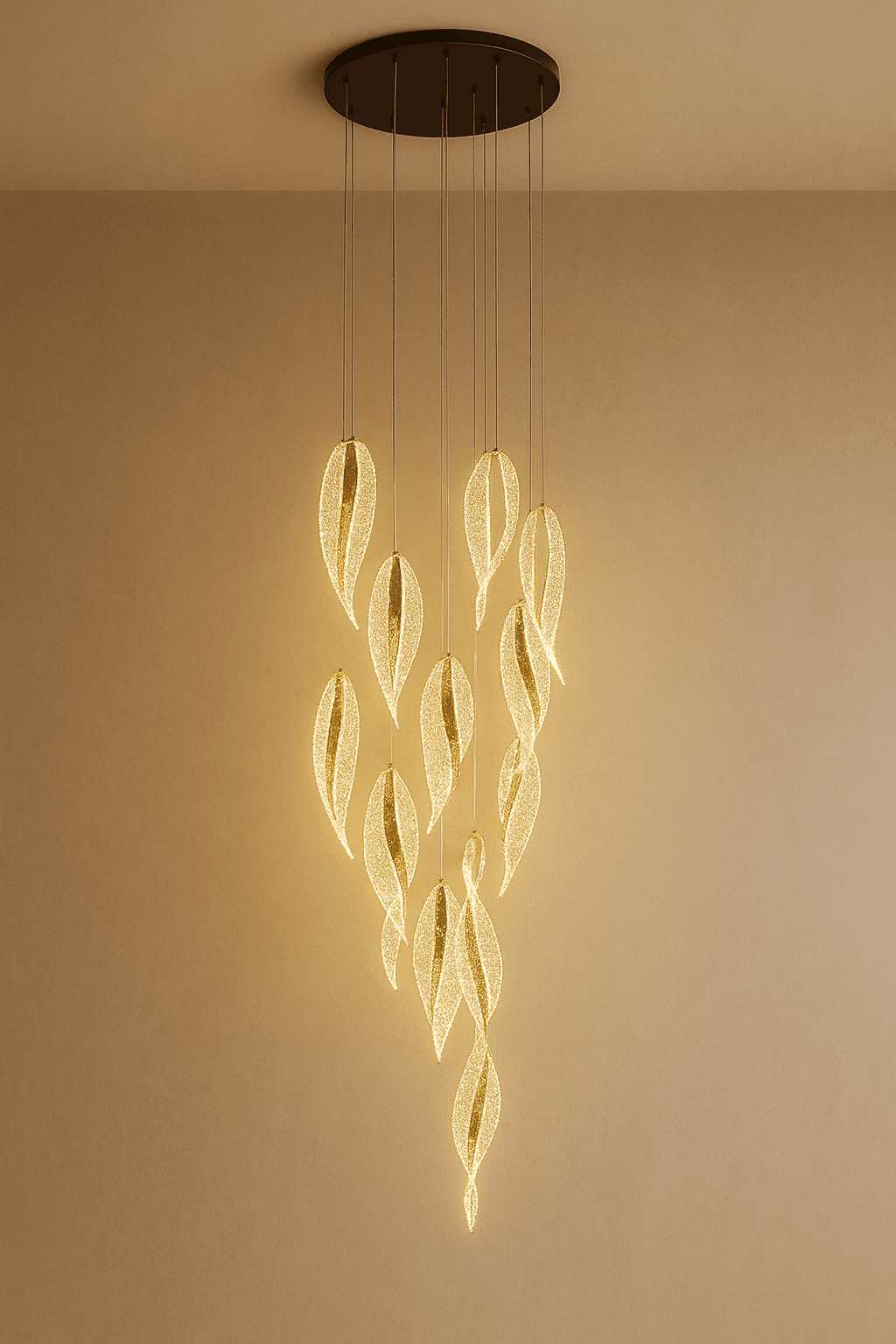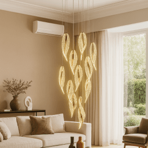 Ndriçim modern me dizajn elegant – ndriques me forma gjetheje që shkëlqen me dritë të artë të ngrohtë, duke i dhënë ambientit tuaj një prekje luksi dhe rafinimi. Ideal për dhoma ndenjeje, ambiente hoteli apo hapësira elegante që kërkojnë stil dhe ndriçim mahnitës