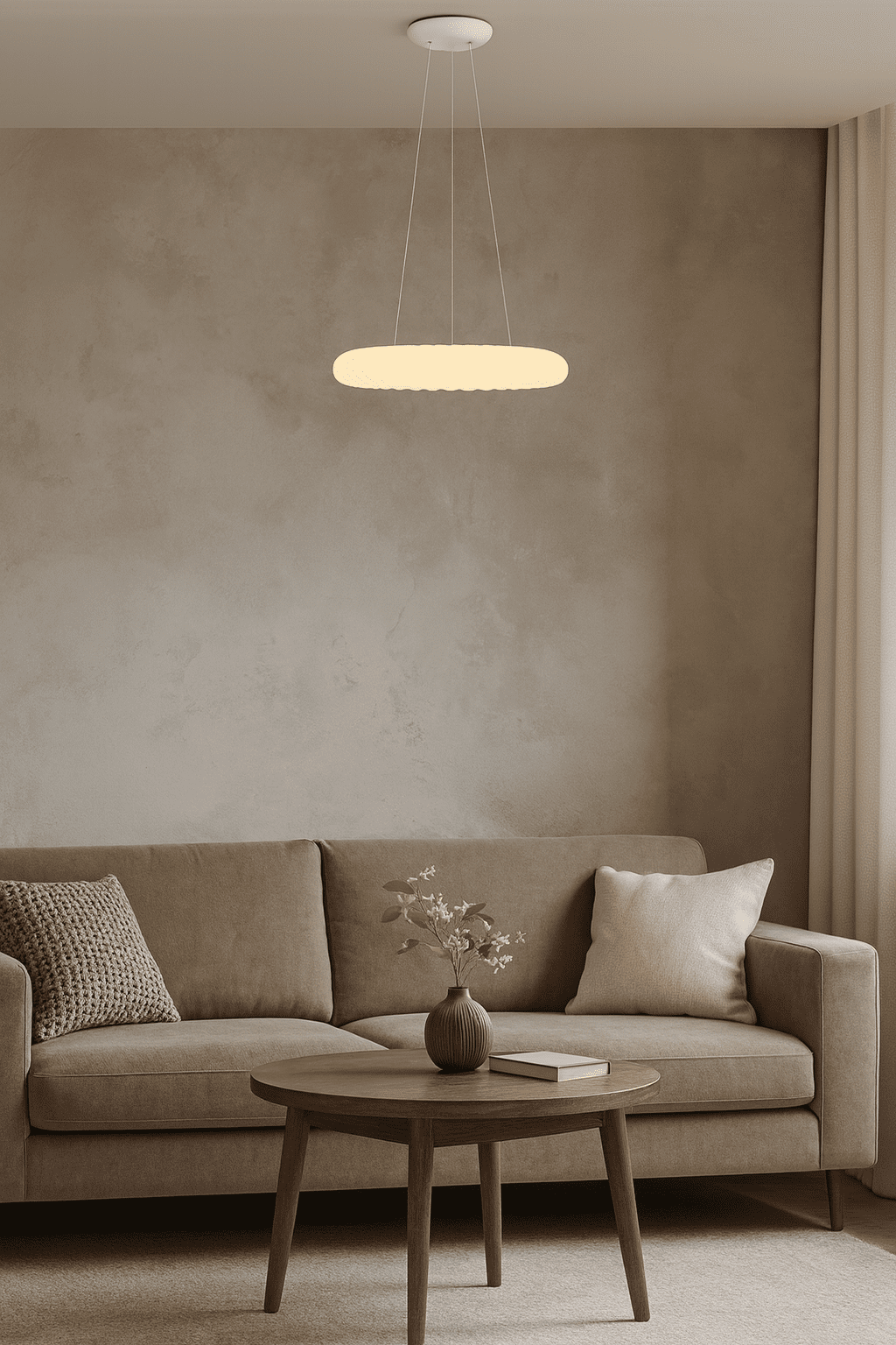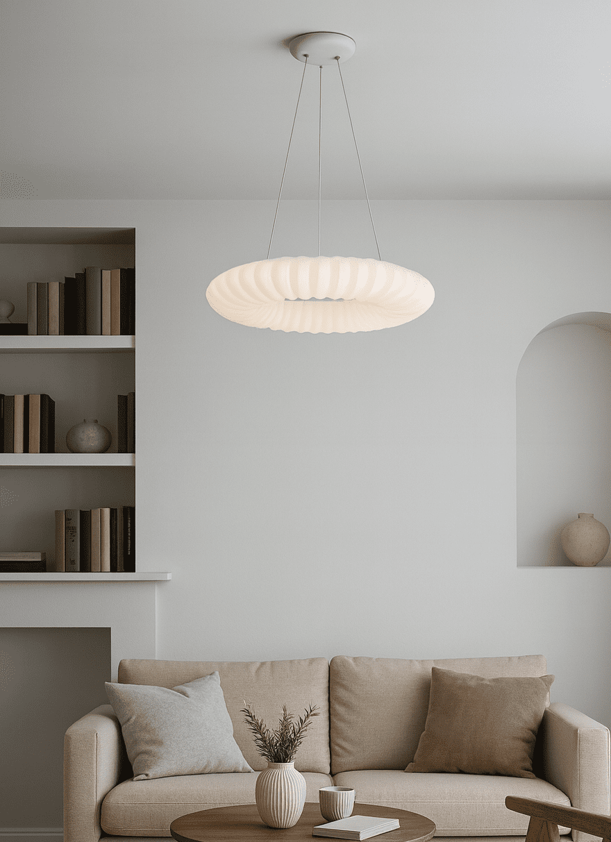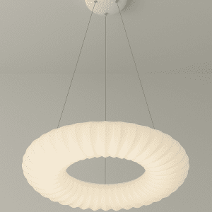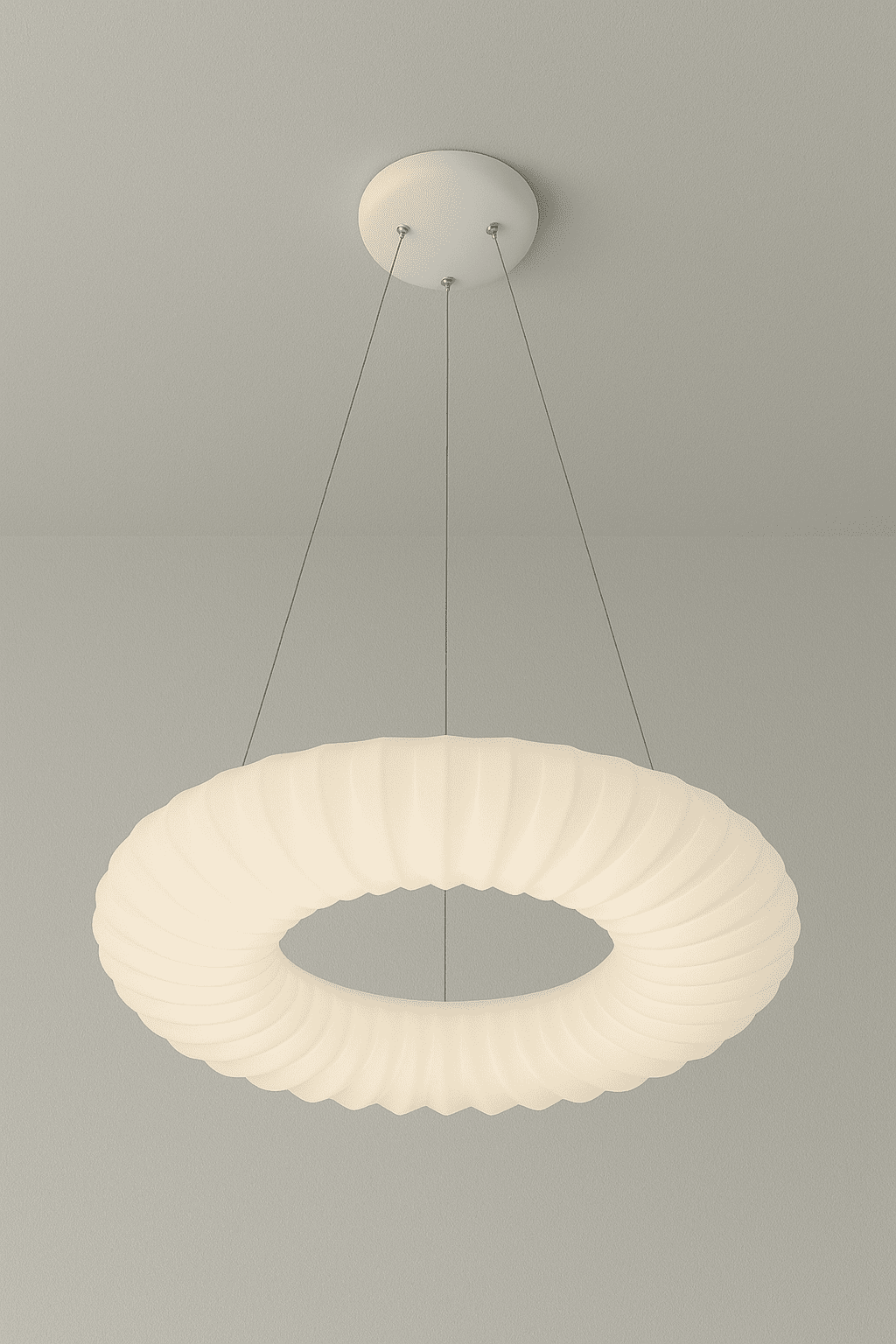 Një ndriçues modern me formë unazore dhe dizajn valëzues elegant, që ofron dritë të butë dhe të shpërndarë në mënyrë të barabartë. I përshtatshëm për ambiente bashkëkohore si dhoma ndenjeje apo studio, ai kombinon minimalizmin me estetikë të rafinuar për të krijuar një atmosferë të ngrohtë dhe relaksuese.