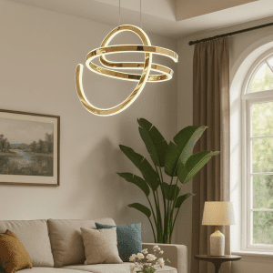 Ky ndriçues modern LED ka një dizajn elegant me forma të lakuara që krijojnë një efekt dritash të buta dhe luksoze. Struktura metalike me përfundim të artë pasqyron dritën në mënyrë harmonike, duke i dhënë ambientit ndjesinë e ngrohtësisë dhe rafinimit. Idealisht përshtatet për dhoma ndenjeje moderne, ku eleganca dhe minimalizmi bashkohen në një pamje tërheqëse.