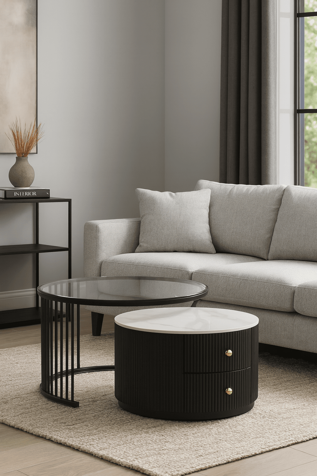 Set tavolinash elegante për ambiente moderne. Tavolina e madhe ka diametër 80 cm dhe lartësi 45 cm, me sipërfaqe xhami të tejdukshme që shton dritë dhe stil. Tavolina e vogël, 60 cm diametër dhe 36 cm lartësi, vjen me sipërfaqe mermeri artificial për një prekje luksi.