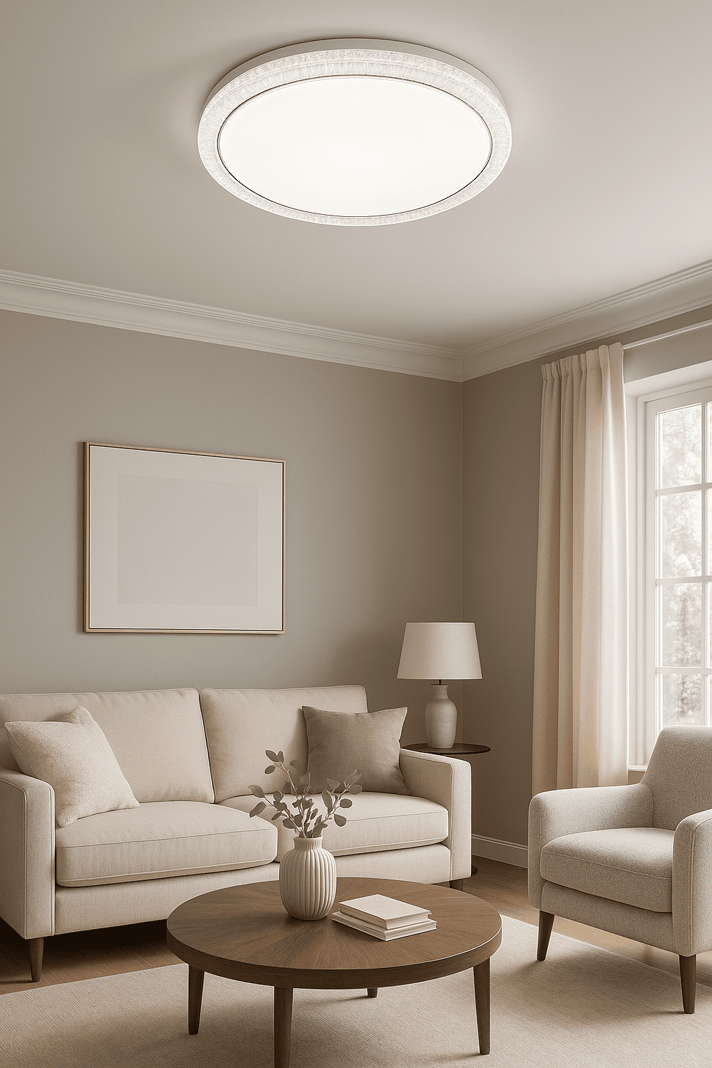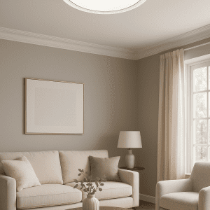 Dritë moderne tavani me dizajn elegant dhe minimalist, që ndriçon dhomën me një dritë të butë dhe relaksuese. Kombinimi i mureve gri të hapur, shtratit me mbulesë të bardhë dhe arredimit të thjeshtë krijon një ambient të qetë dhe të rafinuar — perfekt për një hapësirë të vogël dhe moderne.