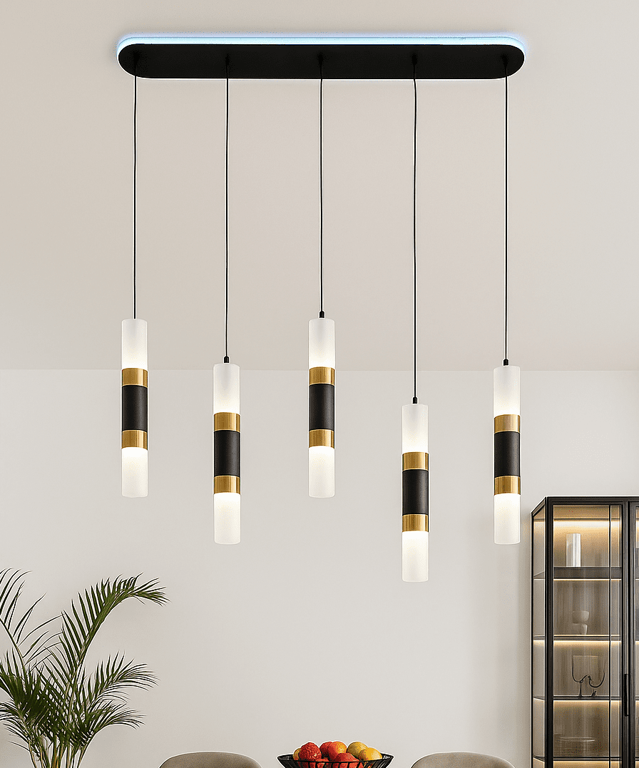 Ky ndriçues elegant me pesë llamba cilindrike kombinuar me ngjyrë të zezë, të bardhë dhe thekse të arta, ofron një stil të sofistikuar dhe bashkëkohor. I varur mbi një tavolinë mermeri me karrige kadifeje në nuanca neutrale dhe këmbë metalike, ndriçuesi përshtatet në mënyrë të përkryer në një ambient të pastër, pa detaje druri, me mur të bardhë dhe tavan minimalist.