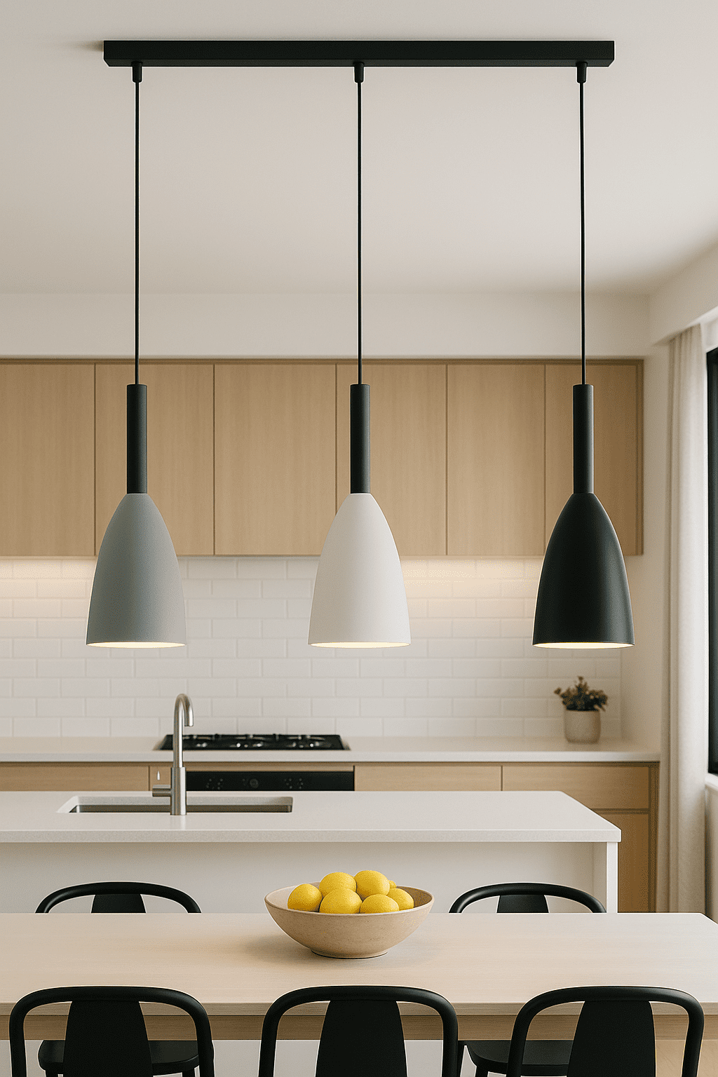 Ky ndriçues modern me tre abazhure të varura — në ngjyra gri të butë, të bardhë dhe të zezë matte — sjell një prekje elegance dhe minimalizmi në çdo kuzhinë bashkëkohore. Dizajni i tij i pastër dhe simetrik ndriçon në mënyrë të butë hapësirën mbi ishullin e kuzhinës, duke krijuar një atmosferë të ngrohtë dhe të qetë.