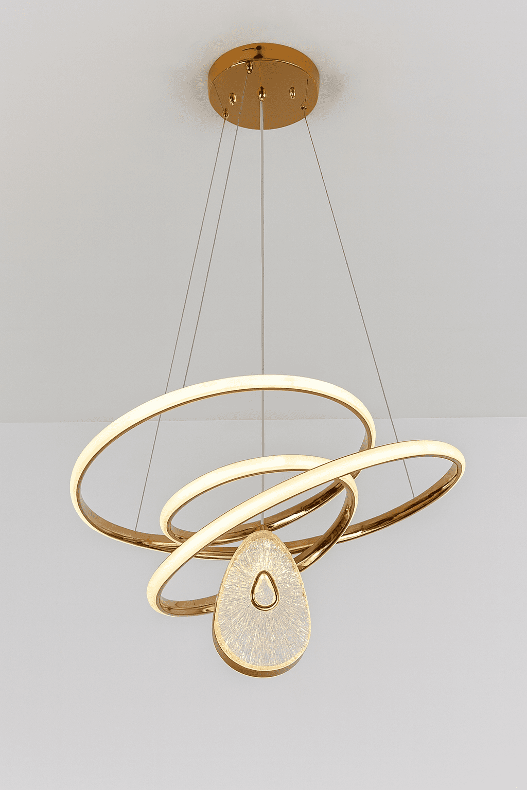 Ky ndriçues modern me unaza LED dhe dizajn kristali sjell elegancë dhe stil në çdo ambient. Forma e tij unike ovale reflekton dritë të ngrohtë dhe harmonike, duke e bërë të përsosur për dhoma ndenjeje moderne me mur të bardhë dhe dekor minimal. Një detaj luksoz që shton ndriçim dhe rafinim në hapësirë.