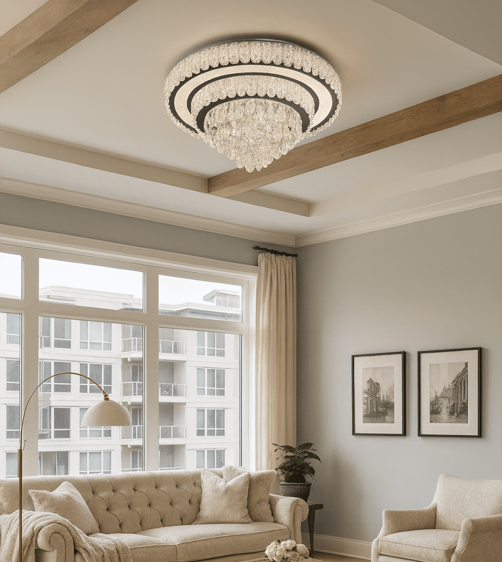 Ndriques elegant kristali ndriçon bukur dhomën moderne, duke i dhënë ambientit një pamje luksoze dhe të ngrohtë