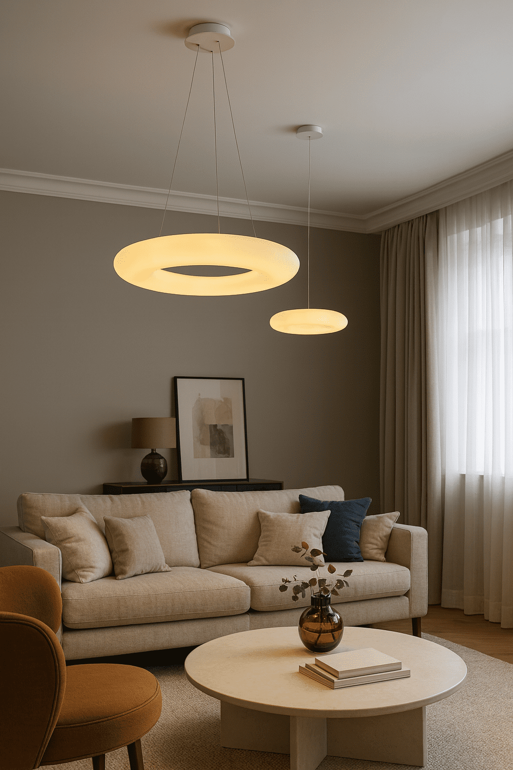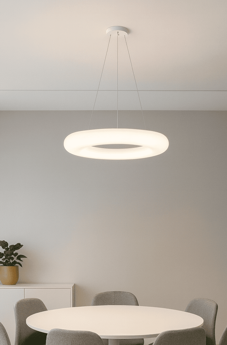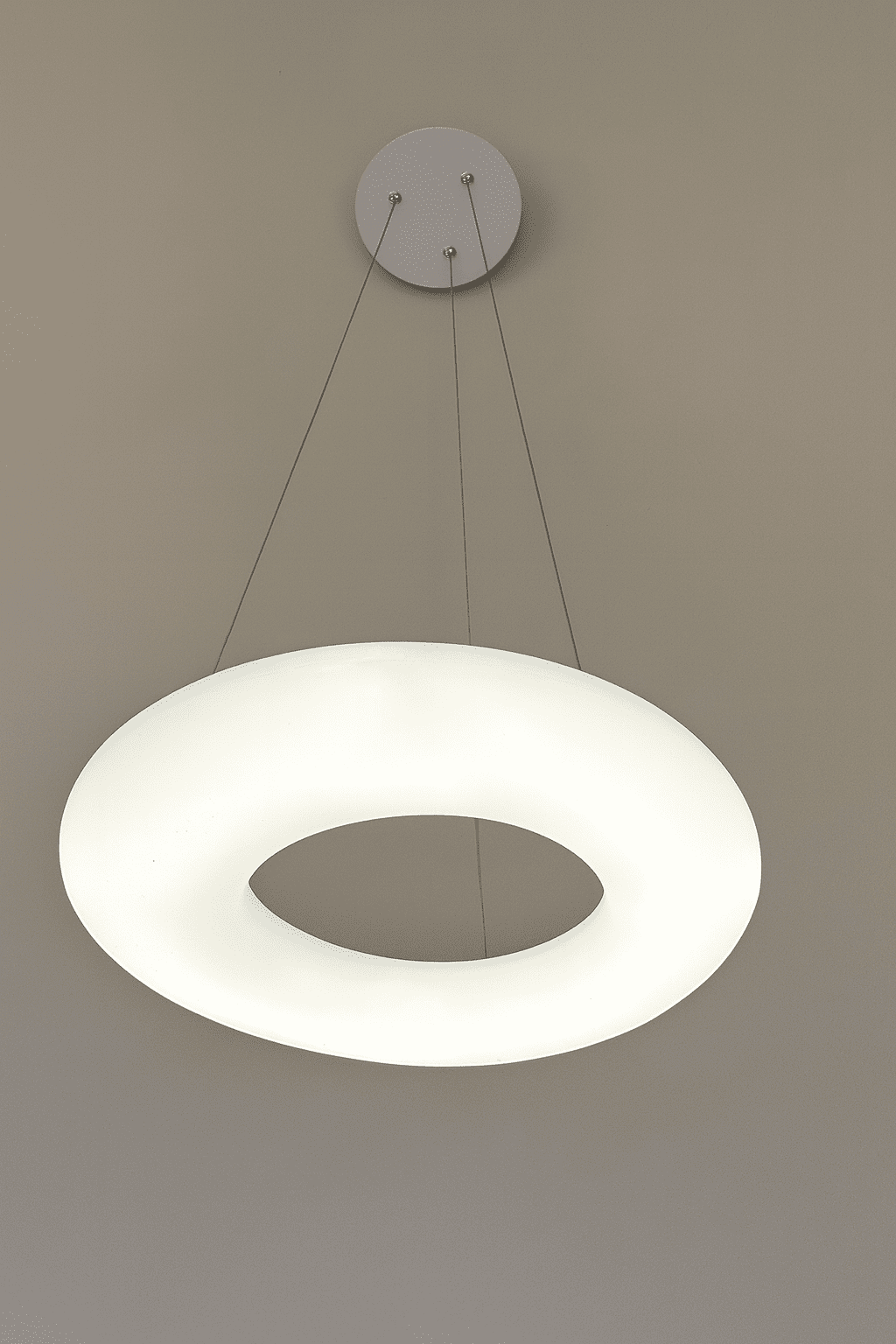 Ky ndriçues modern me formë rrethore jep një dritë të butë dhe të barabartë, duke krijuar një atmosferë elegante dhe të ngrohtë. Me dizajn minimalist dhe varëse të holla metalike, ai përshtatet në mënyrë të përkryer me ambiente moderne, si dhoma ndenjeje apo zyra bashkëkohore. Kombinimi i formës së pastër dhe ndriçimit të qetë e bën një zgjedhje ideale për çdo hapësirë që kërkon stil dhe funksionalitet.