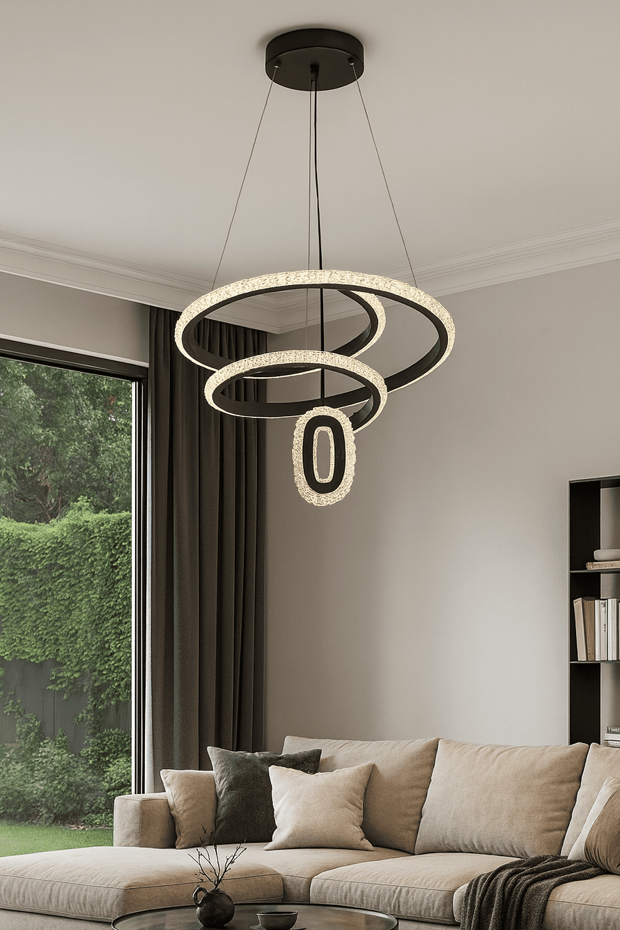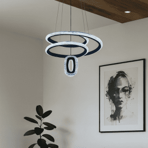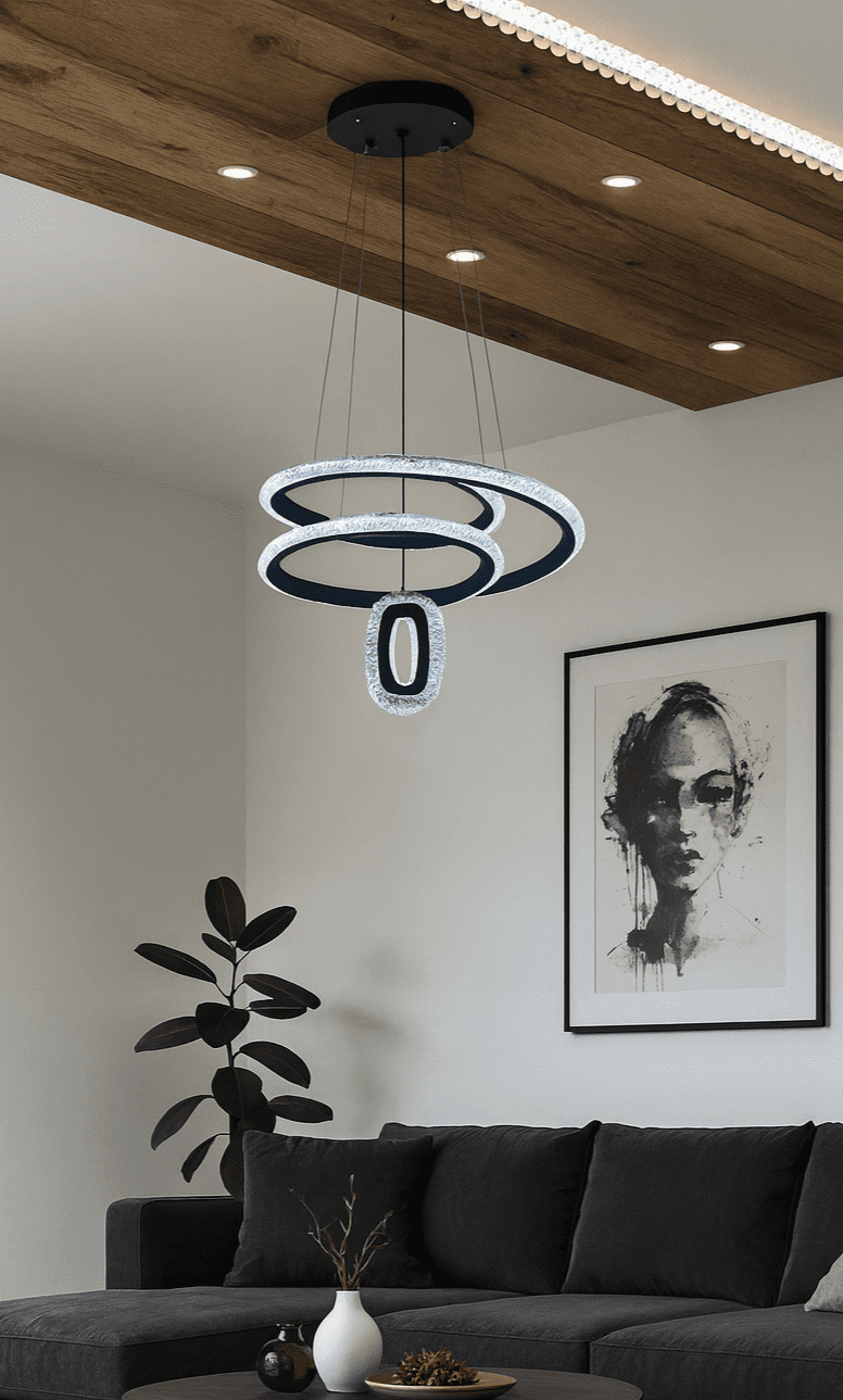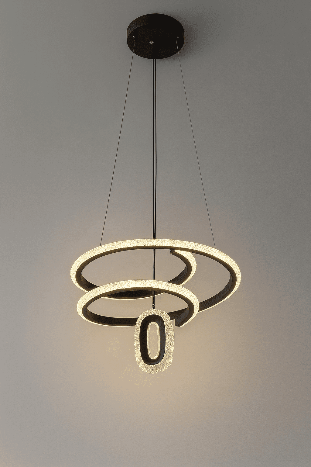 Ky ndriques modern me unaza LED të ndritshme sjell një pamje luksoze dhe elegante në çdo ambient. Dizajni i saj i rrethave të ndërlidhura me kristale të ndritshme krijon një ndriçim të butë e magjepsës, perfekt për dhoma ndenjeje ose ambiente moderne.