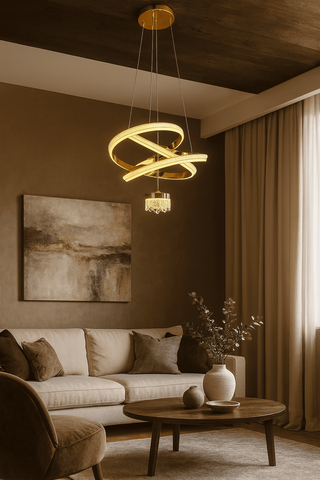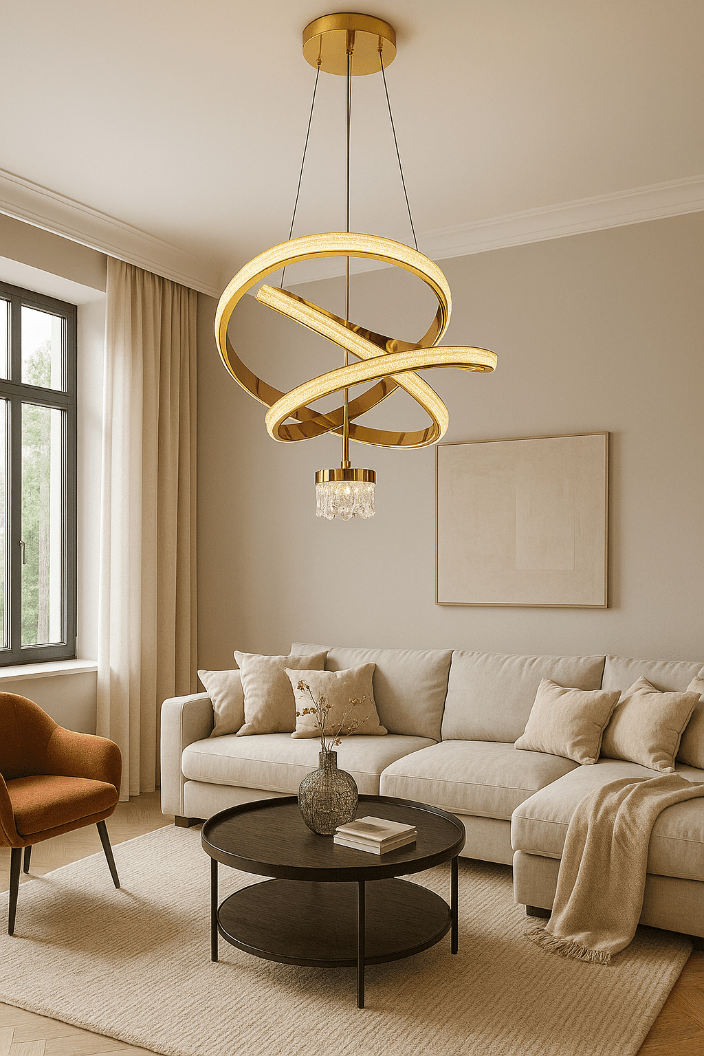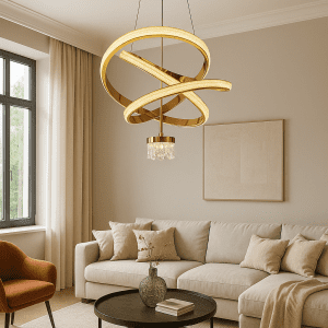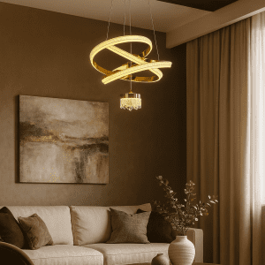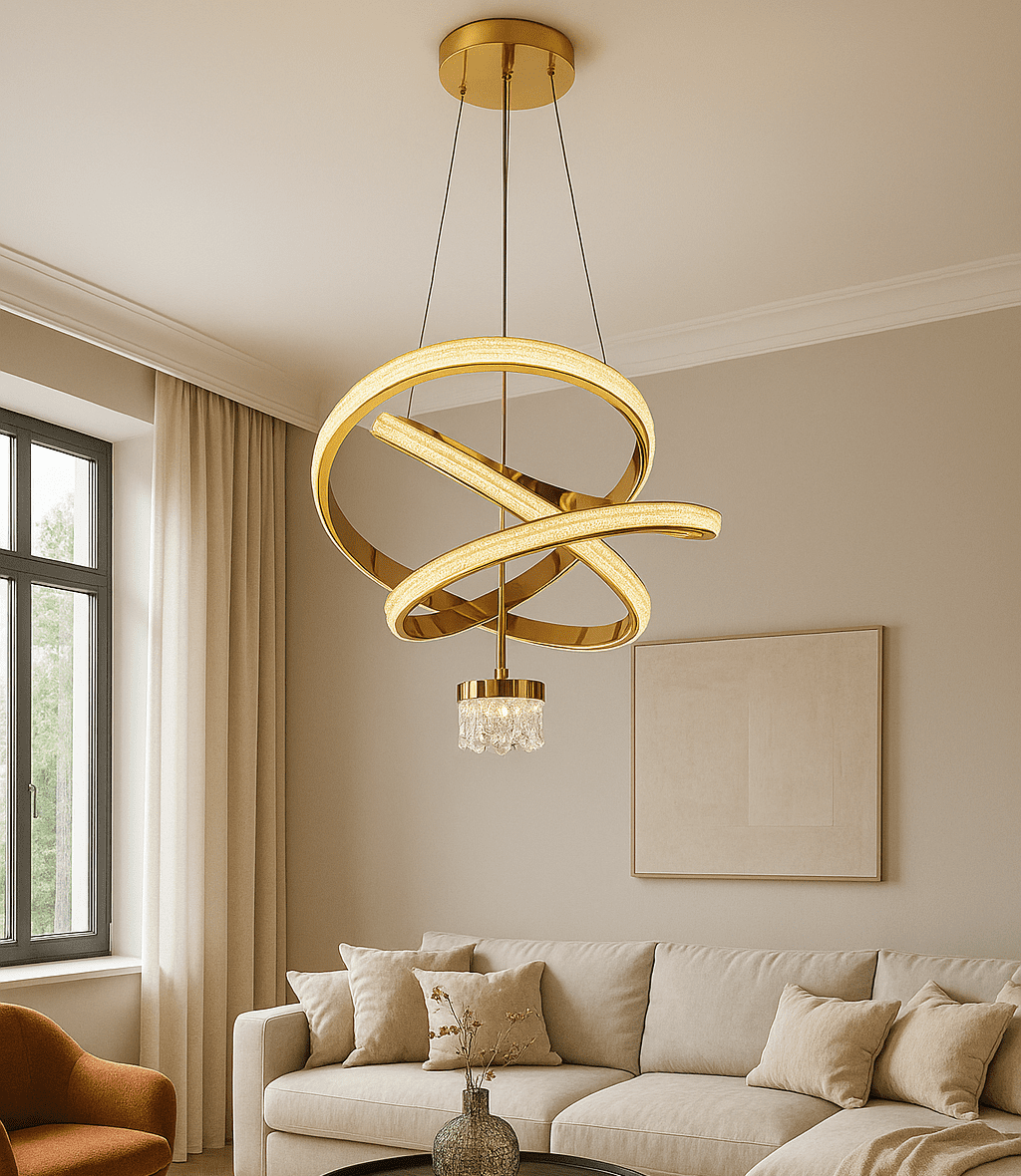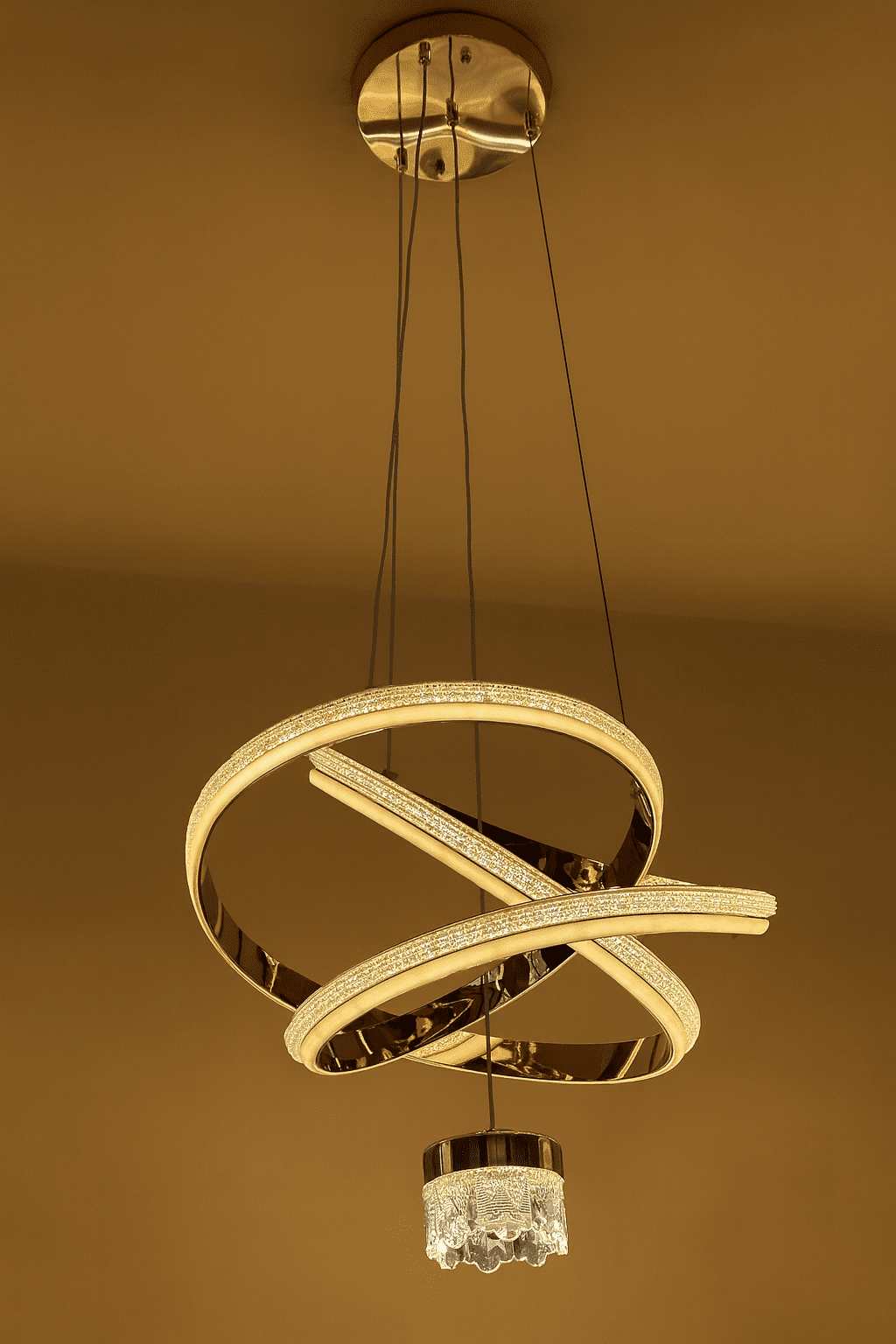 Kandil modern me unaza ari dhe kristale të ndritshme.