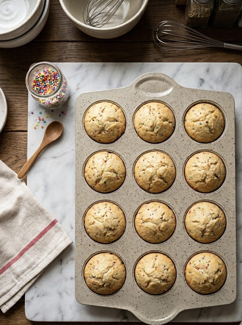 • E mbushur me kekë confetti të pjekur.
